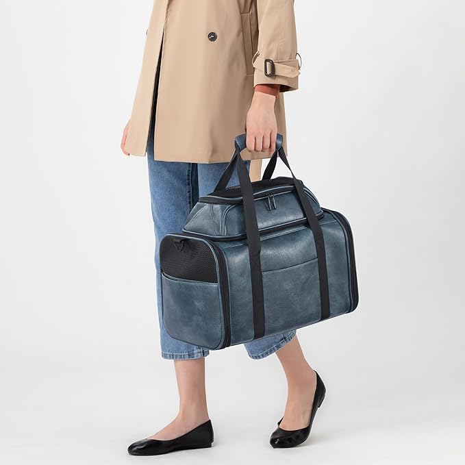 Premium Leather Top Expandable Pet Carrier for Small Dogs & Cats Under 15 lbs, Airline Approved Collapsible Soft-Sided Luxury Travel Bag Blue