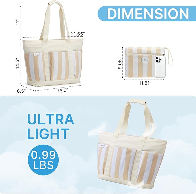 - 【Dimension】:With dimensions of 21.6x6.5x14.5 inch and weighing only 0.99 pounds, this waterproof and sandproof beach bag provides a large storage capacity while staying easy to carry. The included portable small bag measures 11.81x9.06 inch, offering additional storage convenience.