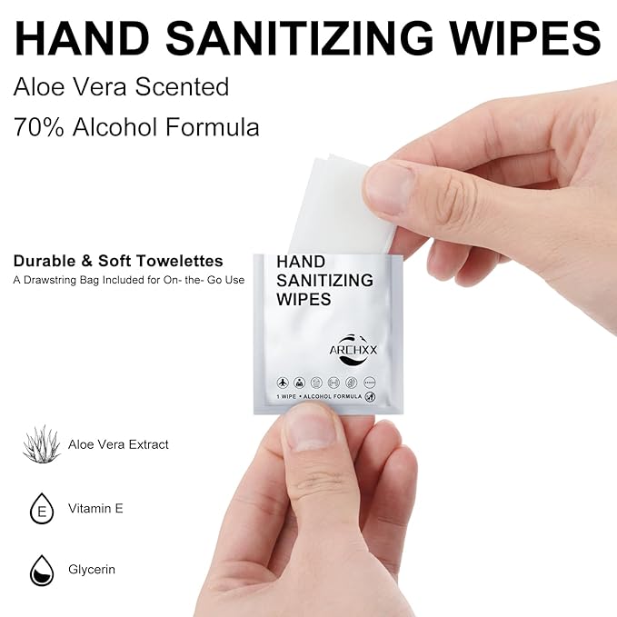 Hand Sanitizer Wipes, 100 Count Non-Woven Hand Wipes Travel Size, Aloe Vera Scent, 70% Alcohol, Individually Wrapped, Sanitizing for Home, Office & Outdoor, Drawstring Bag Included