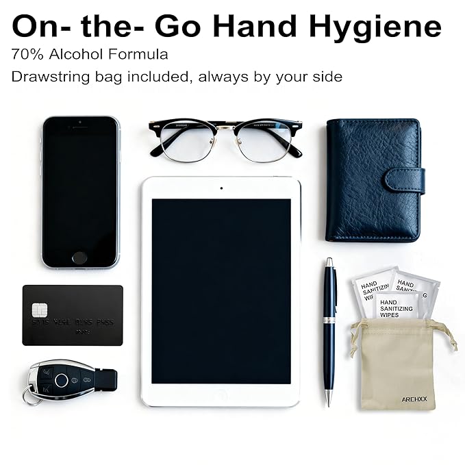 - On-the-Go Hygienic – Compact and portable alcohol wipes, individually sealed for safe hygiene. Ideal as hand sanitizer for school and a practical hand sanitizer travel size option, a travel wipes perfect for daily use in the car, office, gym, and while commuting. All rinse‑free, no water needed