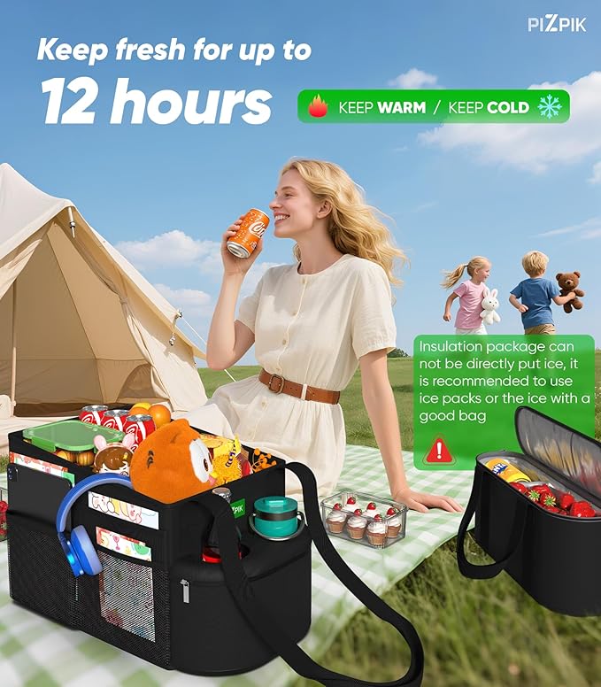 - Multi-scenario Use: It can be the front seat organizer or rear seat. When commuting to work, you can keep your lunch box warm inside the cooler bag. During camping trips, it can store various foods and beverages. It can also organize children's items inside the vehicle.