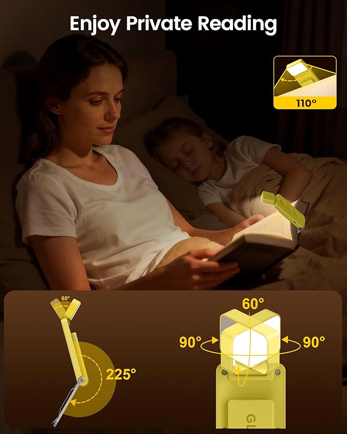 - [Thoughtful & Durable Design] Engineered for quiet, private reading, the 110° light angle minimizes light spill, and the whisper-quiet buttons won't disturb those around you. Adjust the lamp head 90° left/right or tilt it 60° down for precise illumination. Built with strong ABS material and smooth hinges, this reading light for bed clips securely to books of any thickness without leaving marks—and it even doubles as a mini desk lamp when standing on its own.