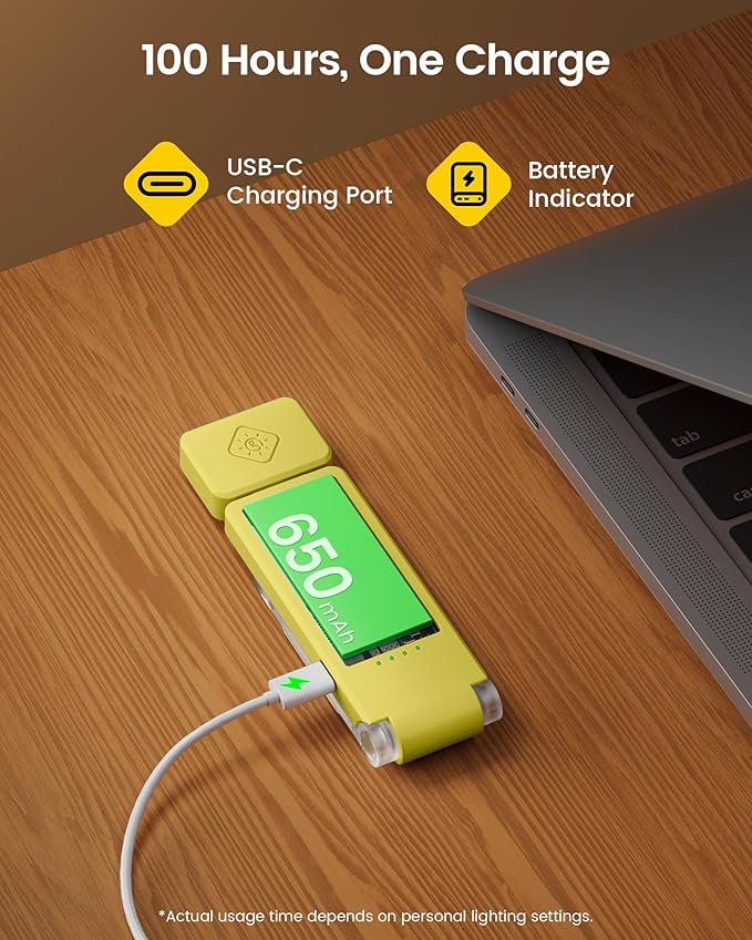 - [Long-Lasting Rechargeable Battery] No more constant charging interruptions. The built-in 650mAh battery delivers up to 100 hours of reading light and full recharges in just 2.5 hours. This means you can enjoy up to 6 months of reading on a single charge if you read for 30 minutes daily. 4 clear power indicators let you check the battery level at a glance and say goodbye to battery anxiety.