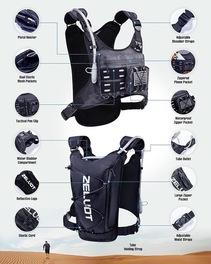 - Plenty of Storage - This chest bag features 3 waterproof zippered front pockets to securely hold essentials like your phone, keys, and energy gels. A detachable, bounce-free pistol holster ensures secure storage for small to mid-sized pistols, while the tactical pen slot keeps emergency gadgets within easy reach. Two large back pockets fit a water bladder, towel, extra clothing.