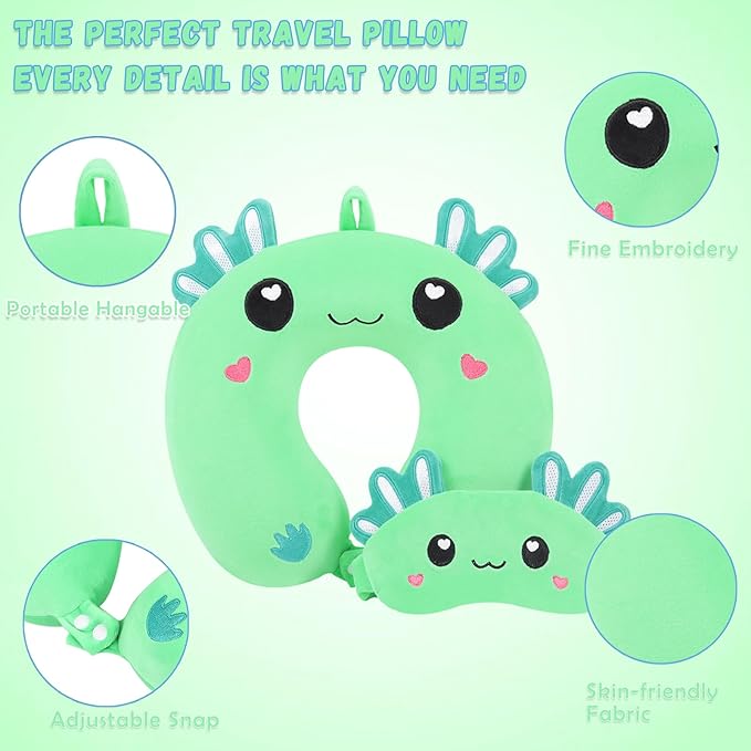 Travel Pillow, Kids Travel Pillow with Sleep Eye Mask Soft Memory Foam Kids Neck Pillow for Boys & Girls, Travel Accessories for Car Airplane Traveling - Green Axolotl