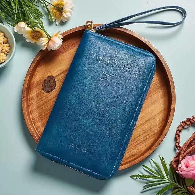 Multi-Functional RFID Passport Wallet,Travel Wallet for Men & Women,With zipper, anti-theft passport holder,Slim Leather Cover for Credit Cards, Tickets, Cash (Blue)