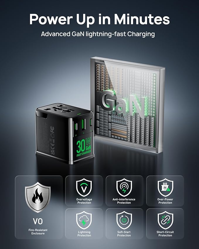 - Power Up in Minutes: Wollzz universal travel adapter is built with advanced GaN to give you the lightning-fast charging experience. Delivers up to 30W and supports PD 3.0 and QC 3.0. It could recharge an iPhone 16 to 50% in just 28 minutes. (Results may vary by device, cable, and conditions.)