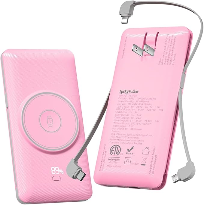 - 6 Devices Charging Simultaneously: This portable charger battery pack features 5 outputs, including 3 cable outputs and USB-C & USB-A outputs. At the same time, you can use wireless charging on the front of the power bank to charge your mobile phone or watch, Charge up to 6 devices simultaneously. For Mag-Safe power bank supports 5W, 7.5W, 10W and 15W wireless charging; USB-C ports support Power Delivery up to 20W, allowing for fast charging of USB-C enabled devices; USB-A ports deliver up to 22.5W, supporting Quick Charge 3.0 for rapid charging of legacy devices