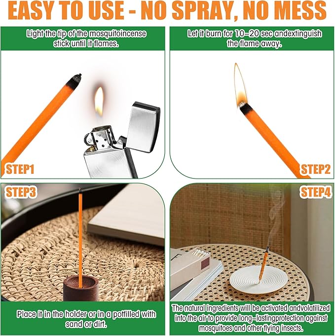 - Hassle-Free & Easy to Use: Light the tip, let it burn for a few seconds, then blow out the flame. Place in the ground, a pot, or a fire-safe holder. Enjoy mess-free bug repelling—no residue, no cleanup, no strong fumes