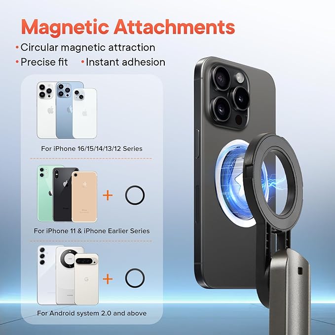 - 【Upgraded Magnetic 2-in-1 Selfie Stick】Our pocket-sized tripod features a 2-in-1 magnetic design. It can be secured to the stand with a magnetic clamp or detached into a magnetic stand. The powerful magnet securely holds your phone in place, allowing you to quickly attach it to the tripod with one hand. The tripod also features two cold shoe mounts, allowing you to connect a microphone or LED light as needed.