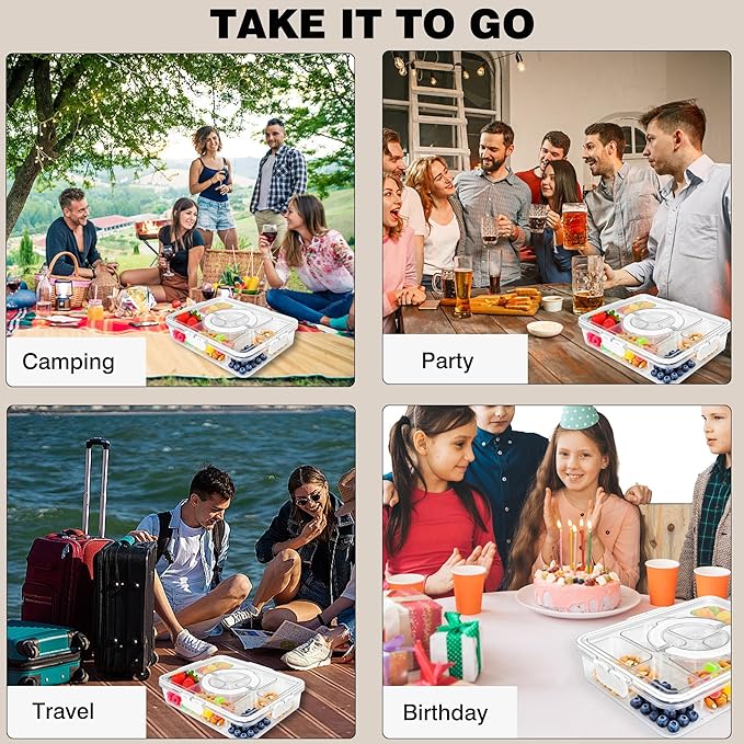 - 【8-Clear Compartments Snack Box container 】Keep snacks perfectly separated with 8 transparent compartments. The crystal-clear body makes it easy to see snacks at a glance, while the durable design ensures long-lasting use. Ideal for organizing fruits, nuts, cheese, sauces, veggies & more, keeping everything tidy, fresh, and ready to enjoy for serving at a party. Built for versatile, mess-free storage, it’s the perfect solution for effortless snack organization.