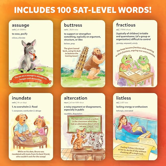 - 50 DOUBLE-SIDED CARDS WITH 100 SAT-LEVEL WORDS: Each card features high-impact vocabulary commonly found on standardized tests, paired with quirky visuals and memorable phrases that lock in learning.