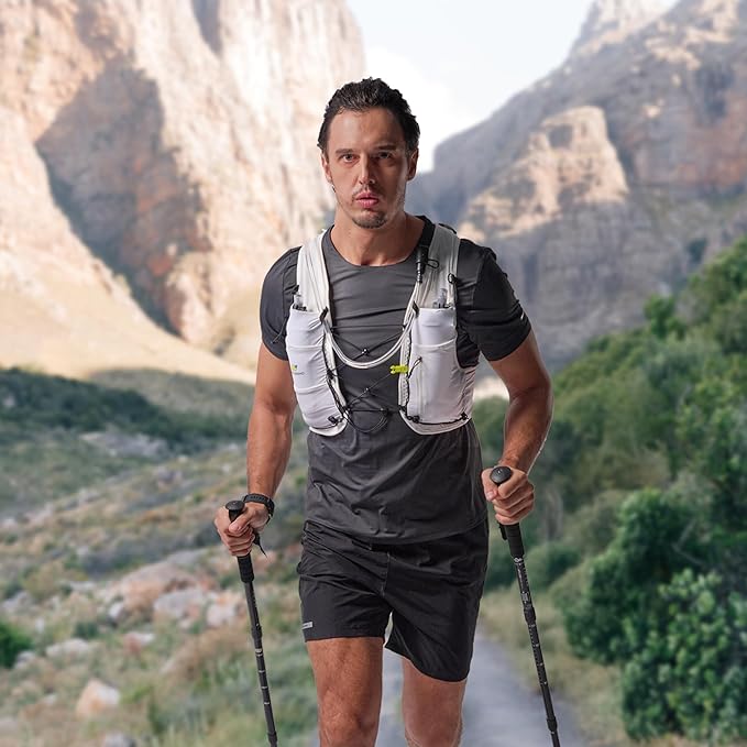 - VERSATILE HYDRATION VEST:Hydropack included 1.5L water bladders + 2×500ml leakproof TPU soft flasks.Maintain optimal hydration during endurance runs with quick-draw spouts and dust-resistant ports.The trekking poles feature three simple and convenient locsms.This lightweight running vest water bottle comfortably holds all your running essentials—water,phone,keys,and nutrition—so you can focus on your sports