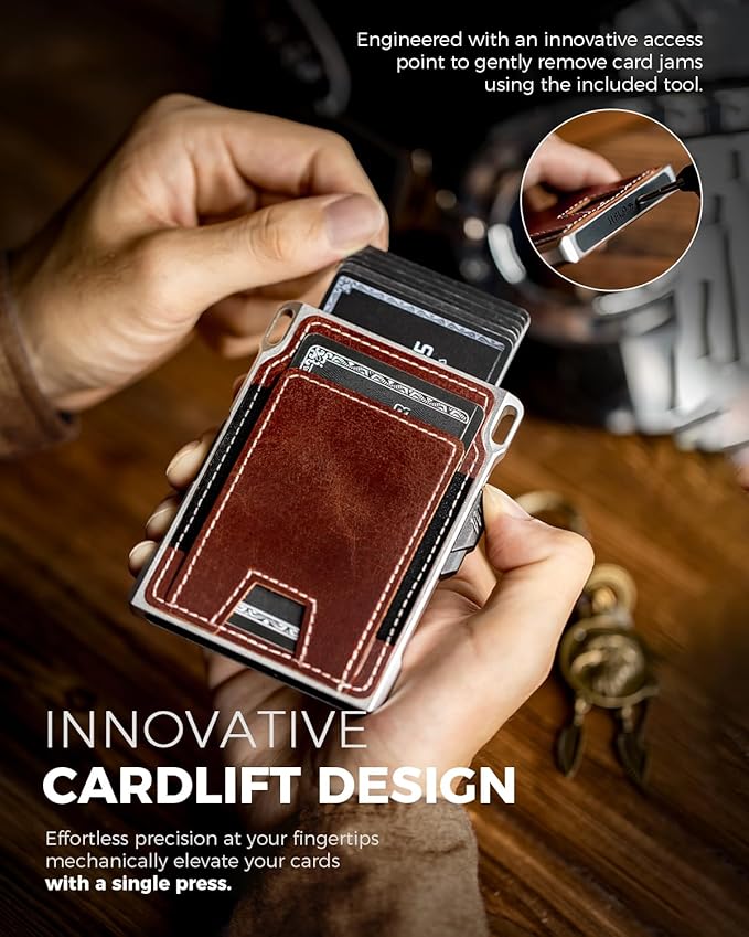- Accessible Design: This premium wallet combines sleek design with practicality. Its one-touch eject mechanism elegantly displays cards in a layered layout for instant access, while the slim profile eliminates bulk without compromising sophistication. A bottom card hole ensures no card gets stuck, and the spacious money clip easily holds over 10 bills. Perfectly blending style and utility, this wallet is a refined accessory for the modern gentleman.