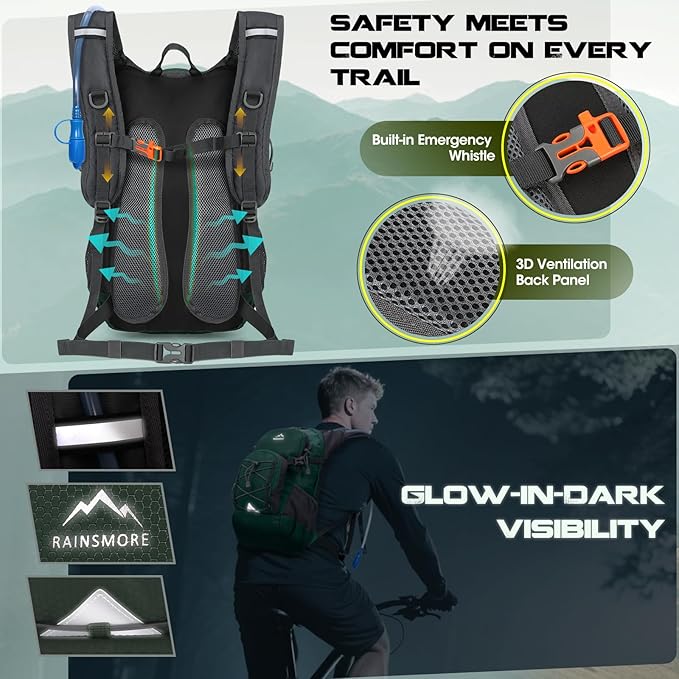 - Ergonomic Carrying System:Comfort is key for long adventures, and this hiking hydration backpack for women and men delivers with an airflow-enhancing back panel and contoured shoulder straps. The 3D mesh padding reduces sweat buildup, while the adjustable sternum strap distributes weight evenly to prevent strain. Making it comfortable for bicycle commuting or light hikes. Reflective accents improve visibility for night runners or cyclists