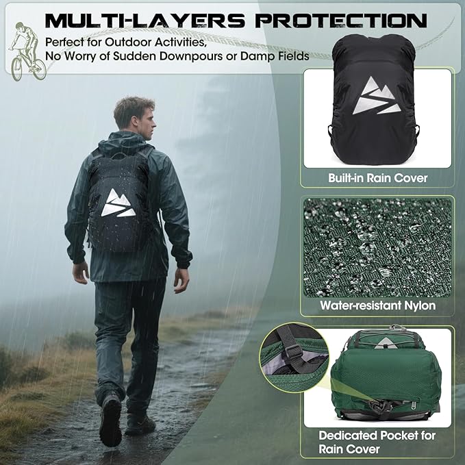- Double Waterproof Protection: Engineered for unpredictable conditions, this Small hiking backpack adopts durable splash-proof fabric to protect your gear from light rain or spills. The included detachable rain cover provides extra protection during heavy downpours and stows neatly in a hidden bottom pocket when not in use. Whether you're caught in a sudden storm on a motorcycle ride or trekking through misty trails, this backpack ensures your belongings stay dry and secure