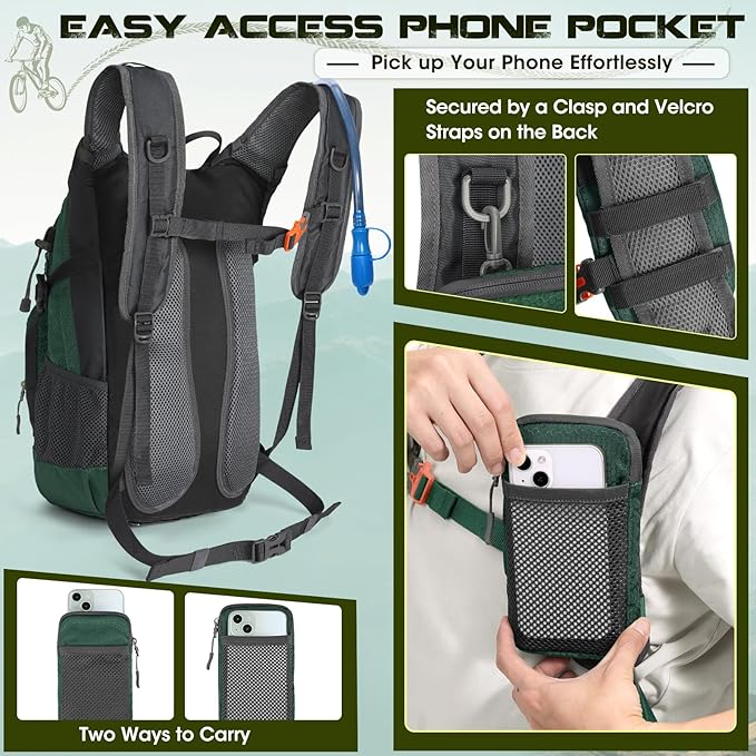 - Compact & Organized: Designed for lightweight hiking and travel, this hiking water backpack (18L) maximizes storage without bulk. The main compartment fits big essentials like a jacket, while you could also roll it up and stuff it in the front slit. A dedicated phone bag offers great accessibility for your device, and external bungee cords and trekking pole loops allow you to carry gear externally. The top zipper pocket and front multi-dividers pocket are perfect for quick-grab items.