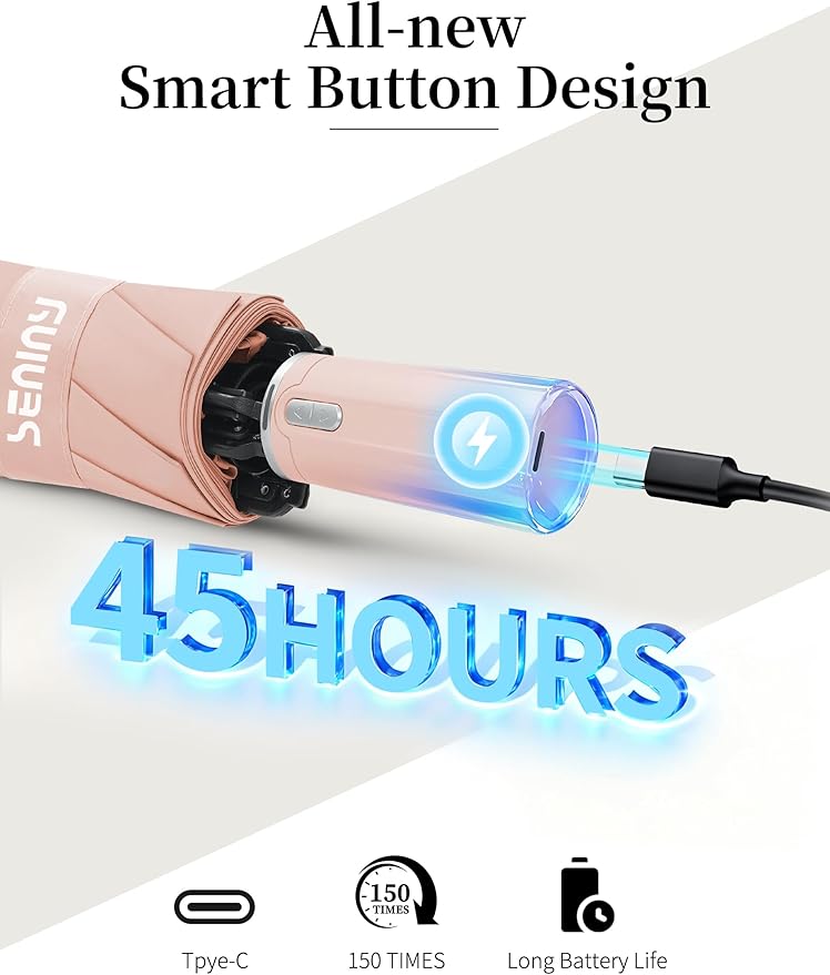 • 【Intelligent Open & Close】The electric small umbrella makes life easier. Press a corresponding button to open/close it effortlessly. Especially, the pole features a unique design - others press hard, ours auto-folds. The upgraded Type-C charging port of the mini umbrella supports long battery life (150 uses/charge) and includes a charging cable.