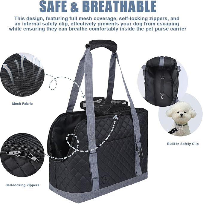 - 【Safe & Comfortable】Our dog carrier purse is made of high-quality quilted fabric, which is sturdy and durable. This pet carrier is equipped with a removable dual-sided bottom board (fluffy fabric and clothing fabric), making it suitable for all seasons and provides stable support. There is a built-in safety rope to prevent pets from escaping from the bag. The top features a breathable mesh, allowing pets to breathe comfortably, providing a safe and comfortable travel environment for your pet.