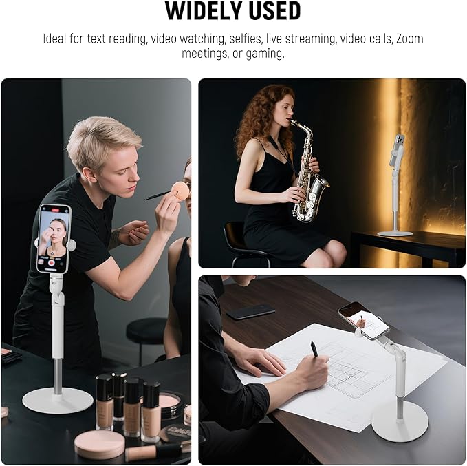 - 【Adjustable Phone Stand】 The white ergonomic desktop phone stand holder features 3.3"/85 mm adjustable height, offering a comfortable viewing angle during prolonged mobile use, great for text reading, video watching, selfies, live streaming, home office desk video calls, computer Zoom meetings, or gaming. The weighted metal base ensures stability while adjusting the phone angle, ideal as content creator and work from home essential gear and influencer must have photography accessories