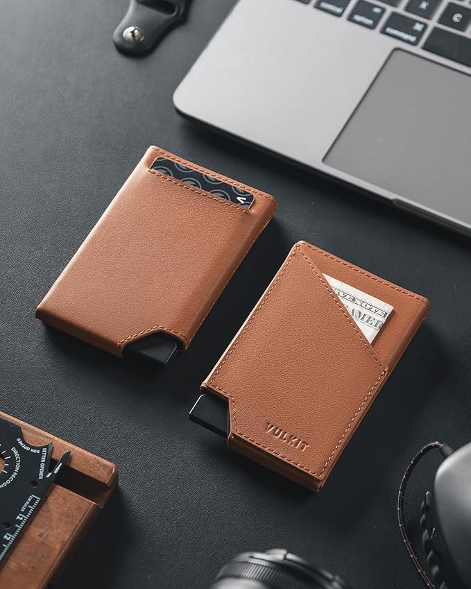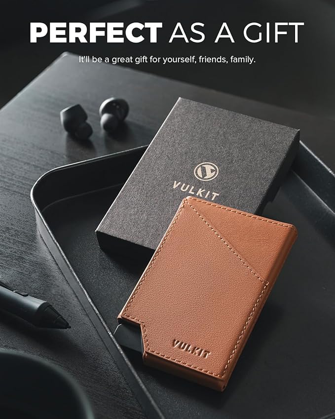 VULKIT Pop up Card Wallet Top-Grain Genuine Leather RFID Blocking Slim Aluminum Metal Bank Card Holder Case with Business Money Pocket for Credit Cards Notes and Coins Brown
