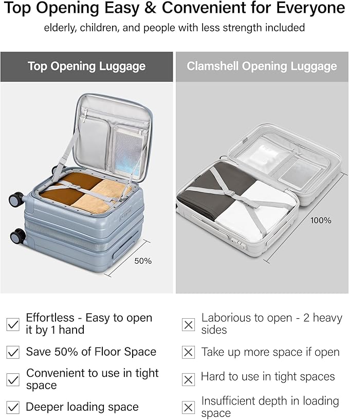 - 【Top Opening Carry On Luggage for Effortless Access Anywhere】This travel luggage delivers an ultra-convenient experience-you can quickly open it with just one hand ,the top opening luggage design also offers convenience to elderly users or people with limited strengthit's and also especially suitable for tight spaces like airplane aisles, allowing you to take out or put back items quickly and easily, unlike traditional clamshell luggage that requires full unfolding to use