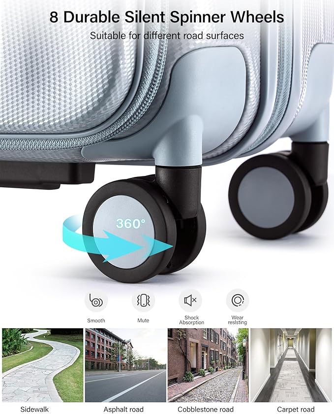 - 【8 Silent Spinner Wheels & Multiple handles for Effortless Mobility】Carryon suitcases with wheels is enabling smooth and quiet rolling on all surfaces, from cobblestones and carpets to airport floors. Paired with top and bottom reinforced handle and a sturdy multi-level adjustable aluminum alloy telescopic handle,you can easily lifted up or find a comfortable grip height for stable, effortless pulling or pushing — rolling luggage letting you move with ease throughout your journey