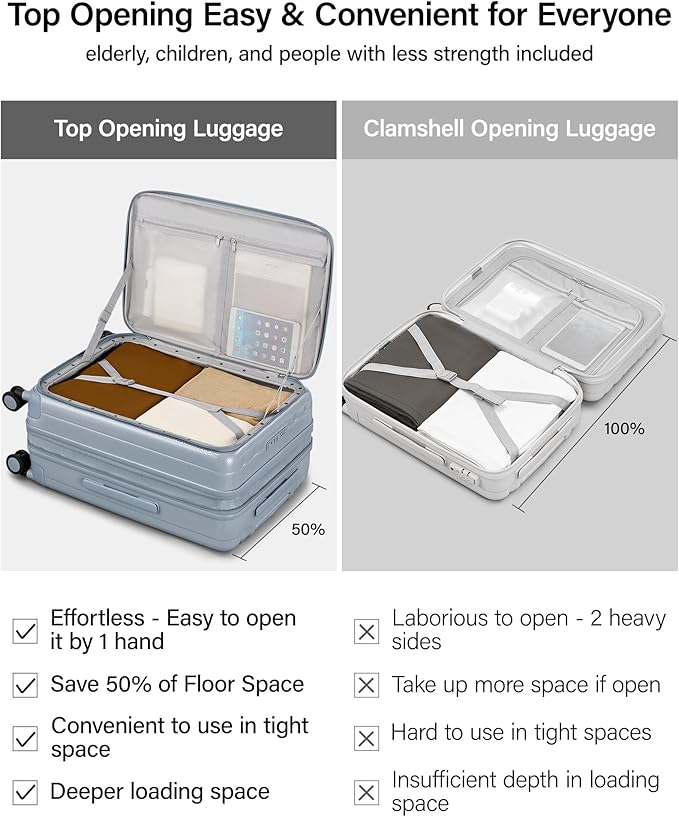 - 【Top Opening Luggage for Effortless Access Anywhere】This 26 inch luggage with spinner wheels delivers an ultra-convenient experience-you can quickly open it with just one hand ,the top opening check in luggage design also offers convenience to elderly users or people with limited strengthit's and also especially suitable for tight spaces like aisles, allowing you to take out or put back items quickly and easily, unlike traditional clamshell luggage that requires full unfolding to use