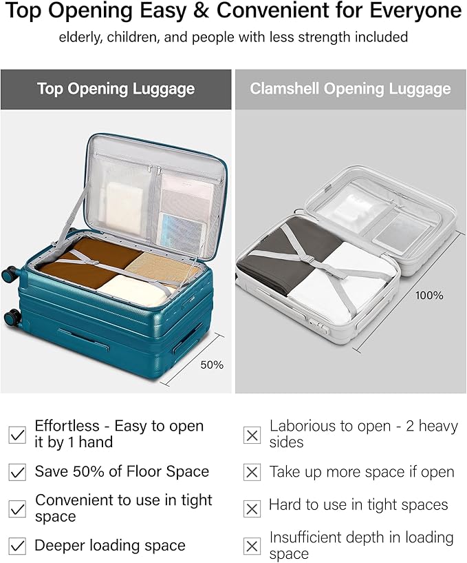 - 【Top Opening Luggage for Effortless Access Anywhere】This 26 inch luggage with spinner wheels delivers an ultra-convenient experience-you can quickly open it with just one hand ,the top opening check in luggage design also offers convenience to elderly users or people with limited strengthit's and also especially suitable for tight spaces like aisles, allowing you to take out or put back items quickly and easily, unlike traditional clamshell luggage that requires full unfolding to use