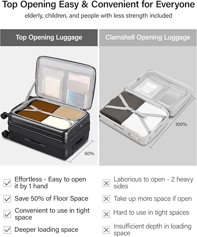 - 【Top Opening Luggage for Effortless Access Anywhere】This 26 inch luggage with spinner wheels delivers an ultra-convenient experience-you can quickly open it with just one hand ,the top opening check in luggage design also offers convenience to elderly users or people with limited strengthit's and also especially suitable for tight spaces like aisles, allowing you to take out or put back items quickly and easily, unlike traditional clamshell luggage that requires full unfolding to use