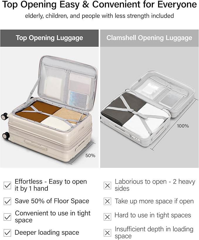 - 【Top Opening Luggage for Effortless Access Anywhere】This 26 inch luggage with spinner wheels delivers an ultra-convenient experience-you can quickly open it with just one hand ,the top opening check in luggage design also offers convenience to elderly users or people with limited strengthit's and also especially suitable for tight spaces like aisles, allowing you to take out or put back items quickly and easily, unlike traditional clamshell luggage that requires full unfolding to use