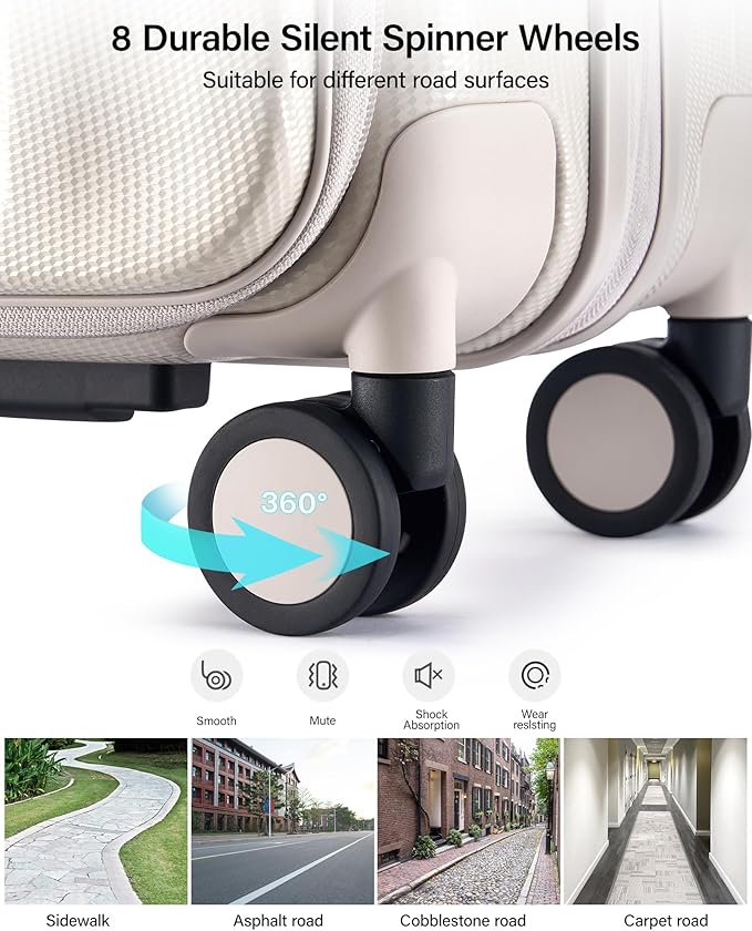 - 【8 Silent Spinner Wheels & Multiple handles for Effortless Mobility】Large suitcases with wheels is enabling smooth and quiet rolling on all surfaces, from cobblestones and carpets to airport floors. Paired with top,side and bottom reinforced handle and a sturdy multi-level adjustable aluminum alloy telescopic handle,you can easily lifted up or find a comfortable grip height for stable, effortless pulling or pushing — rolling luggage letting you move with ease throughout your journey