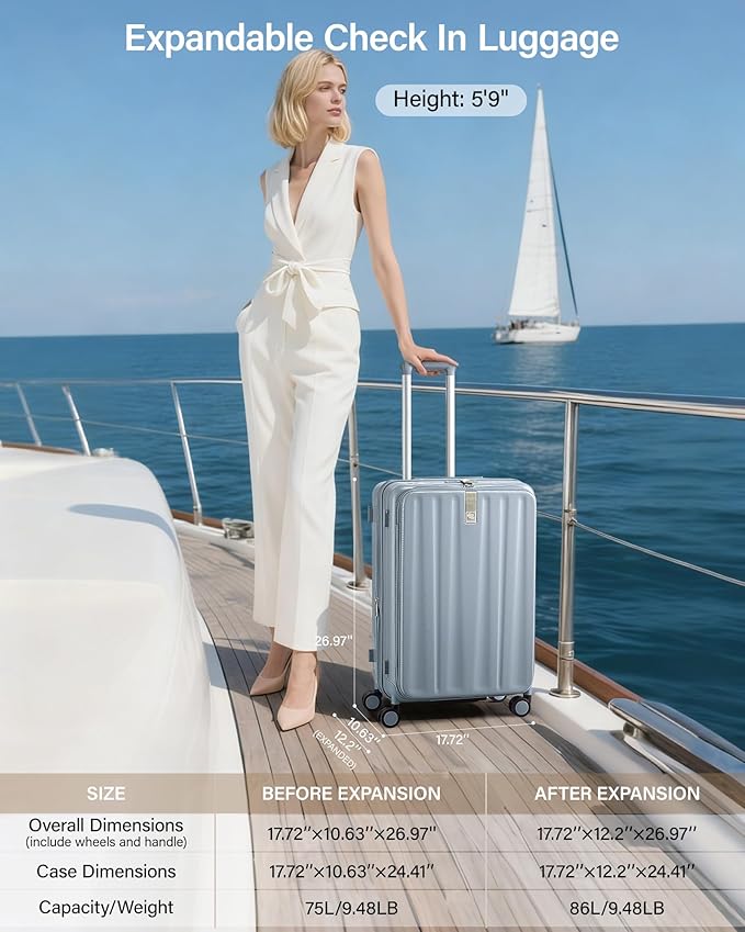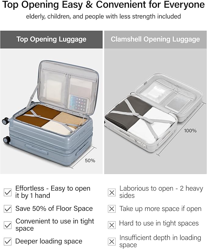 - 【Top Opening Luggage for Effortless Access Anywhere】This 24 inch luggage delivers an ultra-convenient experience-you can quickly open it with just one hand ,the top opening check in luggage design also offers convenience to elderly users or people with limited strengthit's and also especially suitable for tight spaces like aisles, allowing you to take out or put back items quickly and easily, unlike traditional clamshell luggage that requires full unfolding to use
