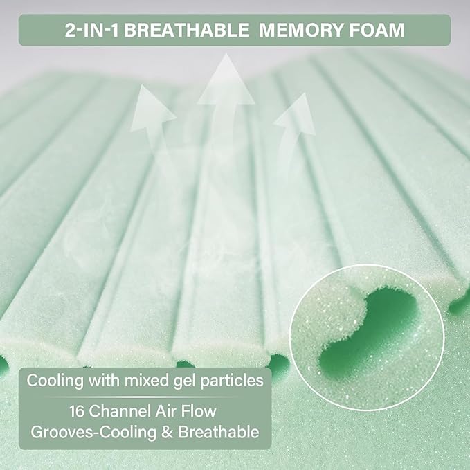 - Rapid Cooling & Ultra-Breathable: The cooling pillow features 16 ventilation grooves on the memory foam surface, enhancing airflow while maintaining structural integrity, boosting breathability for faster heat and moisture dissipation. Additionally, the memory foam is infused with cooling gel particles for dual cooling and ventilation, reducing stuffiness to keep you dry and comfortable all night for restful sleep.