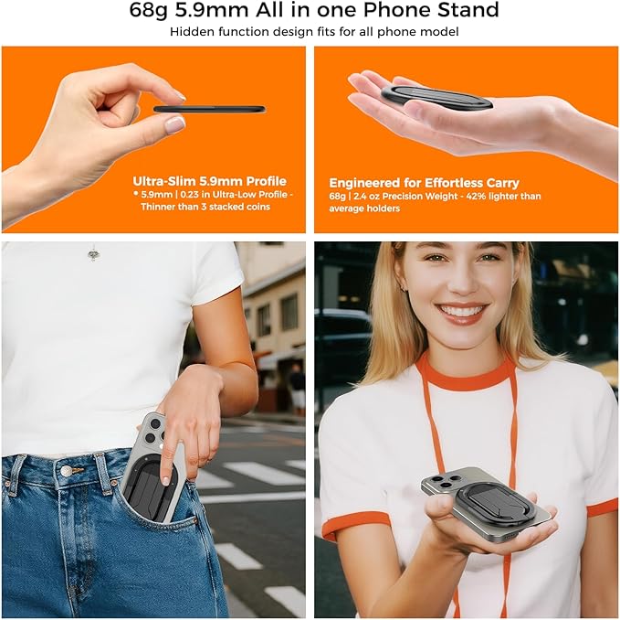 - 【Light and durable】Crafted from ultra-light yet durable aluminum alloy (5.9mm thin / 68g light), this ring stand survives 100,000+ pulls with a 5.5kg weight capacity. The advanced pivot mechanism eliminates all wobble for shake-proof support.