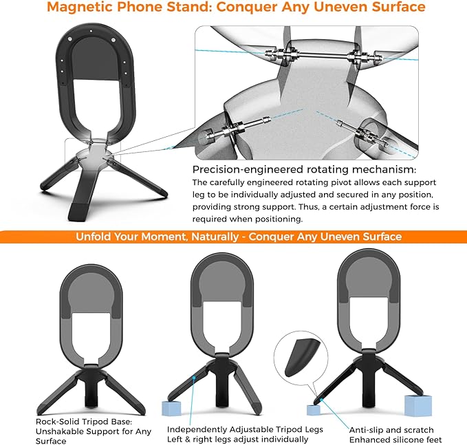 - 【Revolutionary All-in-One Phone Mount】A multi-functional portable system combining magnetic ring grip, desktop stand, and tripod functionalities in a single device.