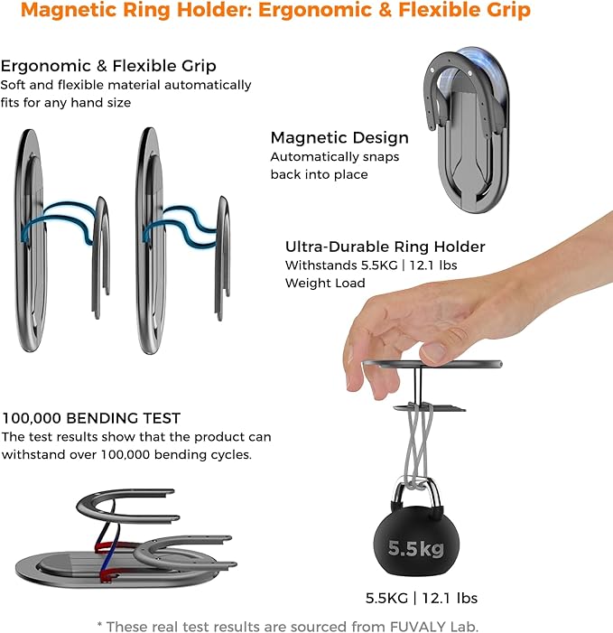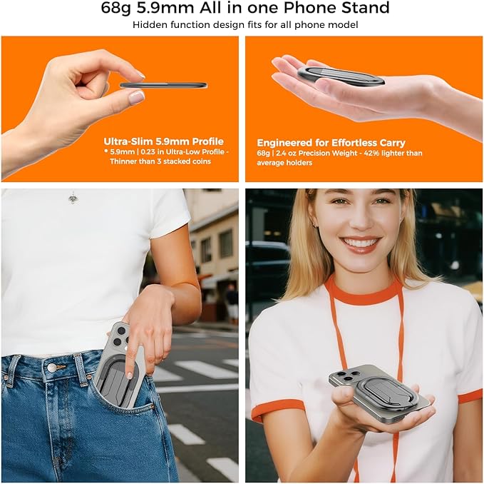 - 【Light and durable】Crafted from ultra-light yet durable aluminum alloy (5.9mm thin / 68g light), this ring stand survives 100,000+ pulls with a 5.5kg weight capacity. The advanced pivot mechanism eliminates all wobble for shake-proof support.