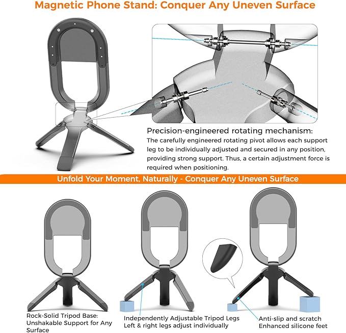 - 【Revolutionary All-in-One Phone Mount】A multi-functional portable system combining magnetic ring grip, desktop stand, and tripod functionalities in a single device.