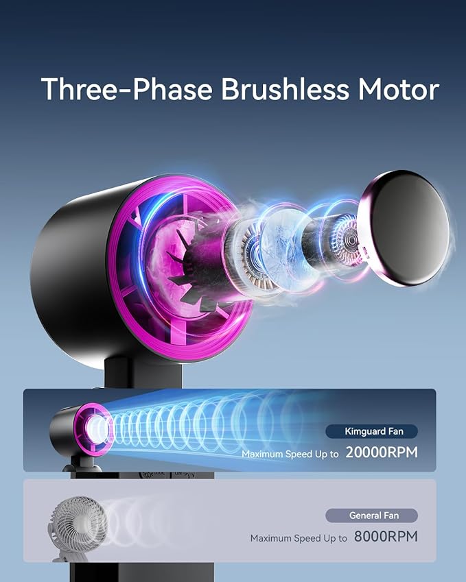- Ultra-Fast Turbo Cooling: Features an advanced 7-blade design paired with a high-speed three-phase brushless motor, delivering a maximum wind speed of 8.5m/s – 2x faster than traditional hand held fans! With a 20000 rpm maximum speed, it instantly blows away the heat, keeping you cool and comfortable all day long
