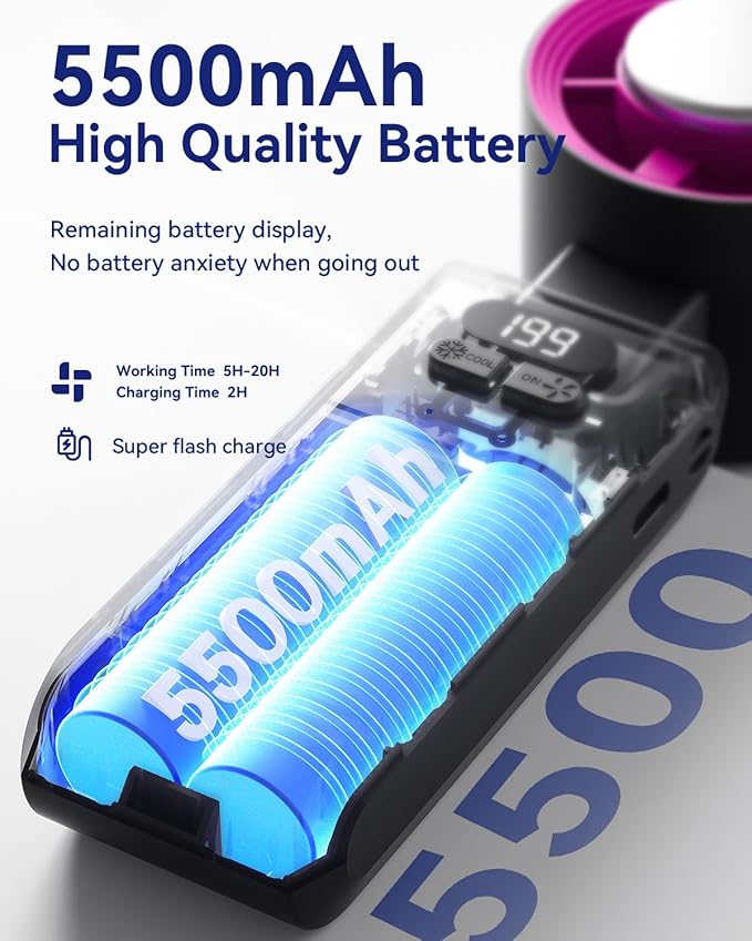 - 20H Max Cooling Time: Our handheld turbo fan is equipped with a powerful 5500mAh rechargeable battery, offering up to 20 hours of cooling time on a single charge, twice the capacity of a standard handheld fan. Enjoy flexible usage with 5-20 hours of runtime, depending on the speed setting. Recharging is quick and convenient, taking just 2 hours via a regular outlet, power bank, or any USB-compatible device