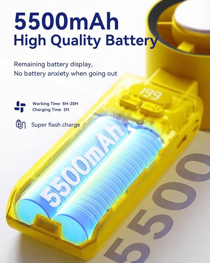- 20H Max Cooling Time: Our handheld turbo fan is equipped with a powerful 5500mAh rechargeable battery, offering up to 20 hours of cooling time on a single charge, twice the capacity of a standard handheld fan. Enjoy flexible usage with 5-20 hours of runtime, depending on the speed setting. Recharging is quick and convenient, taking just 2 hours via a regular outlet, power bank, or any USB-compatible device