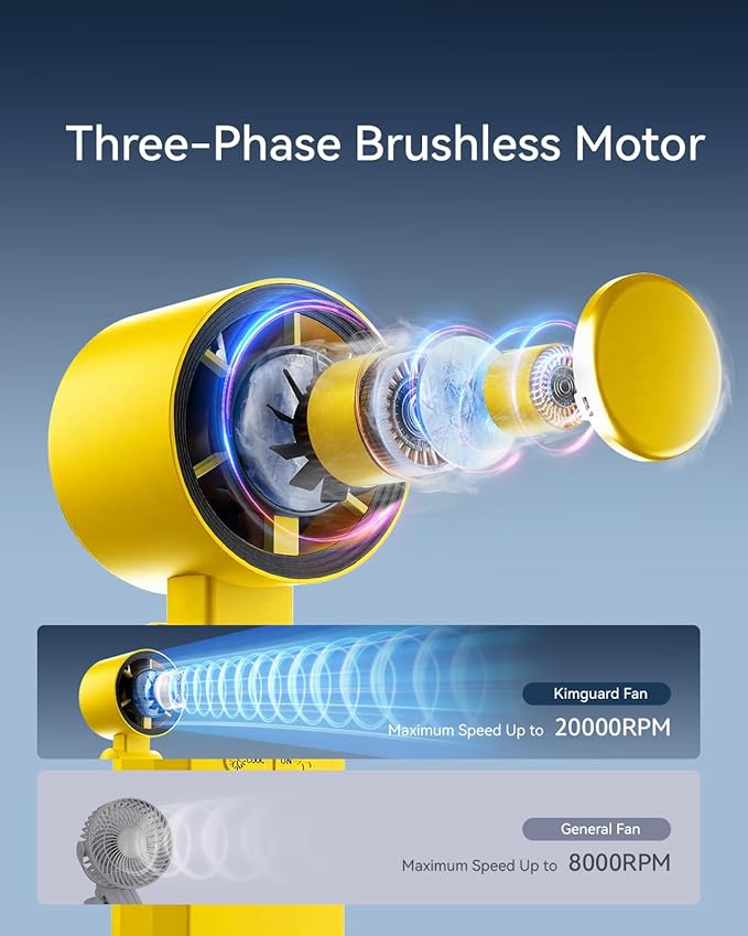 - Ultra-Fast Turbo Cooling: Features an advanced 7-blade design paired with a high-speed three-phase brushless motor, delivering a maximum wind speed of 8.5m/s – 2x faster than traditional hand held fans! With a 20000 rpm maximum speed, it instantly blows away the heat, keeping you cool and comfortable all day long