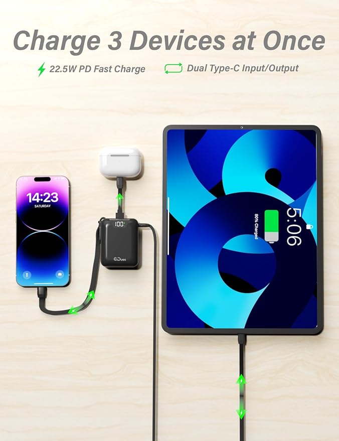 - 🔋【Built-in Cable with Two-Way Charging】No more carrying messy cables! This power bank comes with a built-in charging cable that supports both input and output, letting you charge your devices and recharge the power bank itself with the same cord. With 3 outputs working simultaneously, you can charge up to 3 devices at once