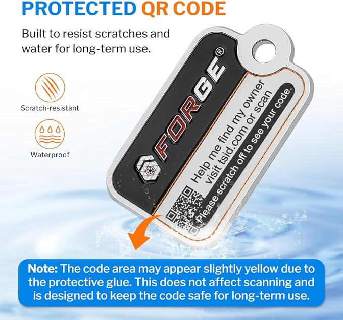 - Zinc Alloy and Thickened Steel Wire – Built to Last Forge Smart Lost & Found Tags are crafted from solid zinc alloy, each Forge tag is paired with a thick stainless steel wire loop—designed to withstand years of pulling, tossing, and handling without breaking or fraying. We also apply a special protective coating over the QR code to guard it against scratches, fading, and water. Your QR code is key—we made sure it lasts.