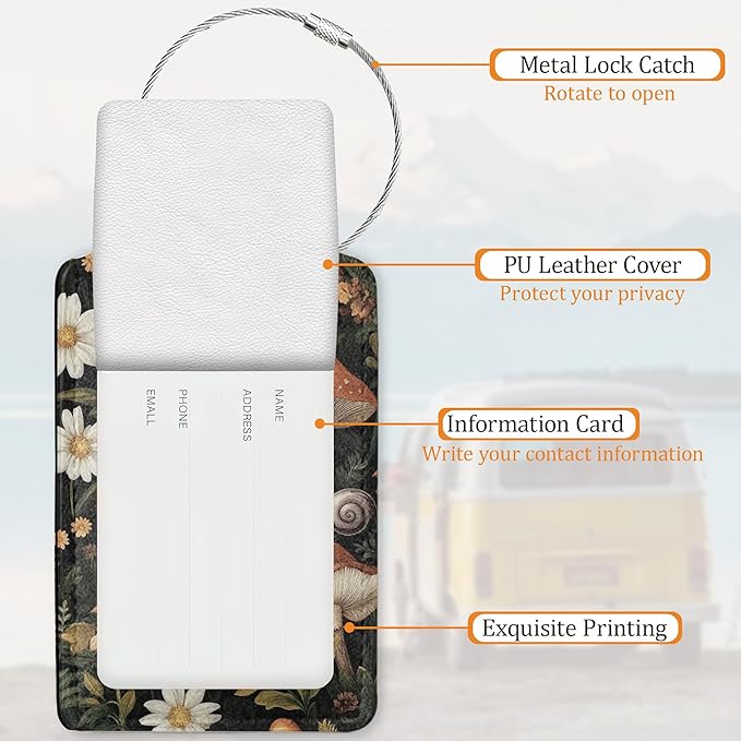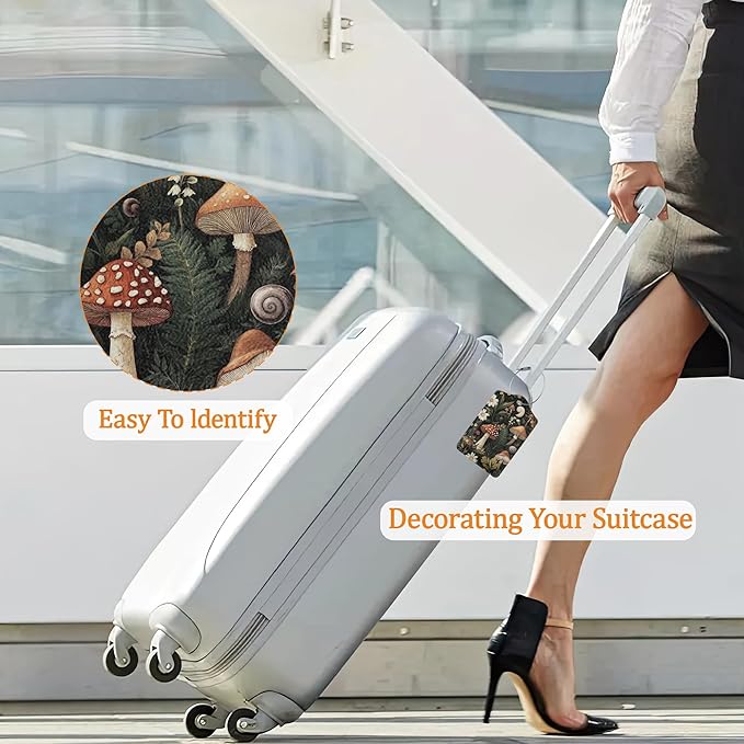 Cute Mushroom Luggage Tags for Suitcases, 3 Pack Leather Bag Tag Identifiers with Stainless Steel Loop and Address Card for Men Women