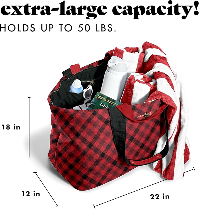 - LARGE TOTE BAG - Our travel bag measures 22"x18"x12", extra large and sturdy enough to carry all the travel bag essentials, pool bag must haves and beach vacation essentials. Designed to hold up to 50lbs, the only tote bag that fits "all the things".