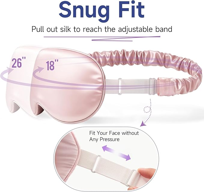 - Adjustable Buckle Strap for Different Heads: The Upgraded and Unique buckle strap design snugly fits heads from 18" to 26", ensuring our sleep masks for women stays in place during sleep. The silk-wrapped strap prevents ear pressure, while keeps your hair from becoming frizzy and tangled