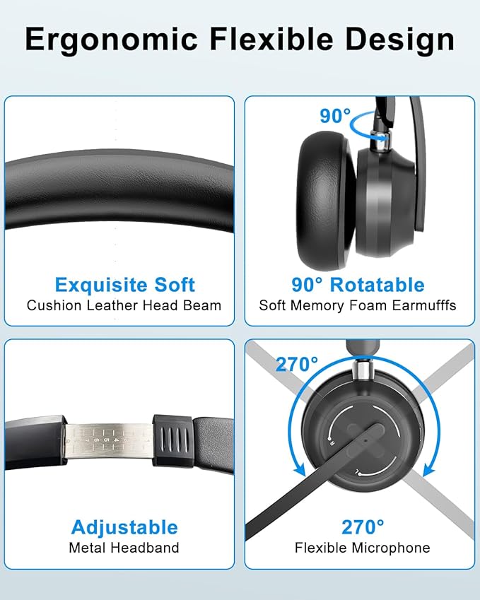 - ✅ Adjustable Headset with Mic & All-Day Comfort: Featuring soft, breathable protein memory foam cushions and adjustable headband to prevent heat and sweat during long use. The 270° rotatable mic and 180° swivel cups fit either ear. All-day wear without pressure or discomfort. (Weighs just 0.3lb/5.09 oz)