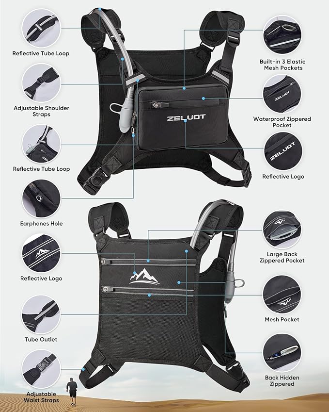 - Plenty of Storage – Zelvot chest pack features 2 waterproof zippered front pockets with inner mesh compartments to securely hold essentials like your phone, cash, keys, and energy gels. A built-in headphone port lets you enjoy music and take calls comfortably on the move. Two large back pockets are ideal for a water bladder, towel, or extra clothing. Additionally, a hidden back zippered pocket offers discreet, secure storage for your valuables.