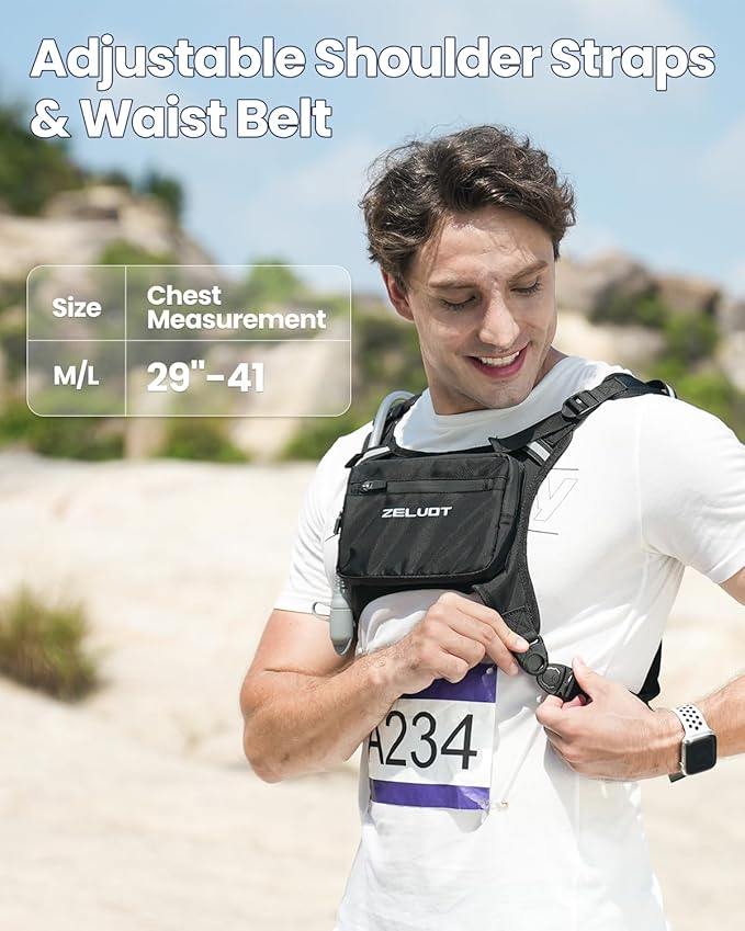 - Adjustable Shoulder Straps & Waist Belt - The Zelvot running backpack is designed for optimal comfort, featuring widened adjustable shoulder straps to distribute weight evenly and reduce strain. The adjustable waist belt minimizes bounce and shifting, preventing chafing from an improper fit. The chest adjustability range of this running vest for women or men: 29"- 41", making it adaptable to different body types.